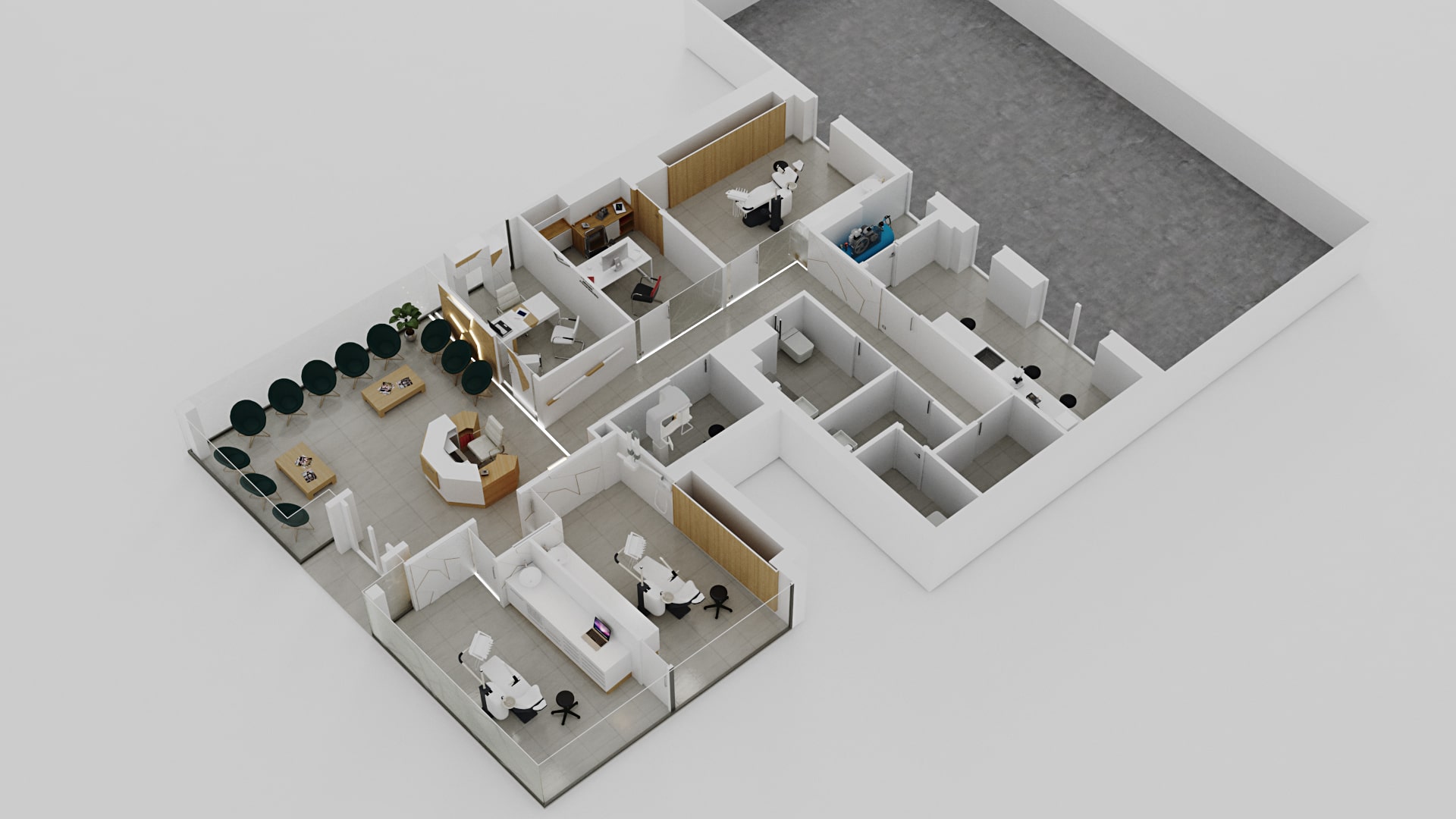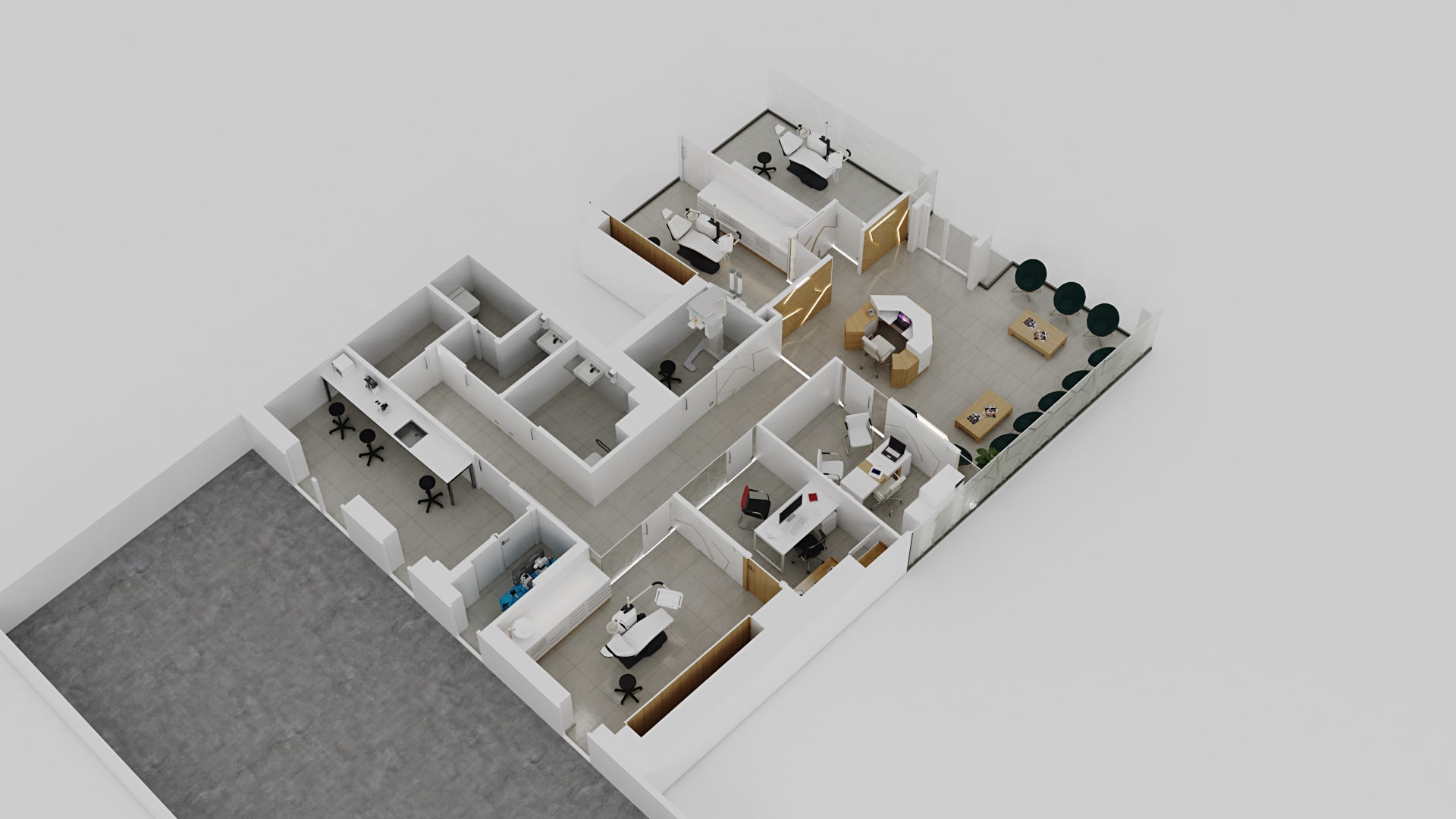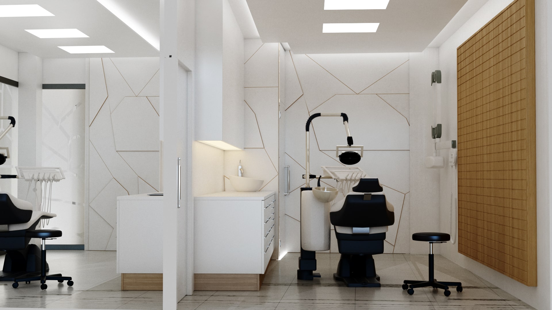 En este proyecto de diseño integral, transformamos completamente el espacio para crear un ambiente moderno, acogedor y funcional. Comenzamos con la recepción, donde diseñamos un área de bienvenida que combina elegancia y comodidad para los pacientes. Los diferentes box de trabajo fueron equipados con el mobiliario y la tecnología necesarios para garantizar un entorno ergonómico y eficiente para el personal médico. Además, creamos despachos privados con un diseño que promueve la privacidad y el confort, ideales para consultas con los pacientes. La sala de esterilización fue optimizada con materiales de fácil limpieza y equipos de última generación, cumpliendo con los más altos estándares de higiene. La fachada del edificio se renovó con un diseño atractivo y moderno, destacando la identidad de la clínica. Por último, el diseño de la luminaria y el mostrador fue pensado para ofrecer una iluminación adecuada y una estética coherente con el resto del espacio.