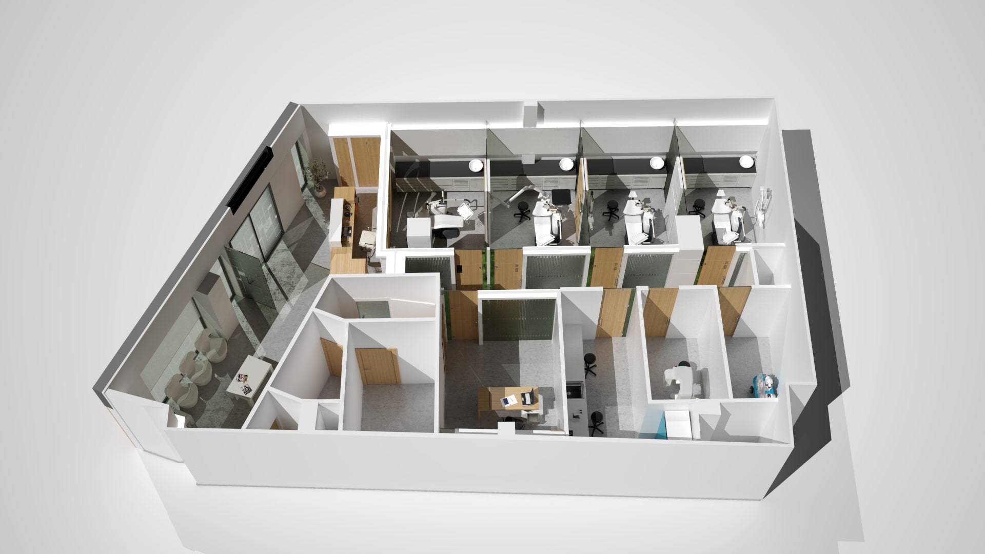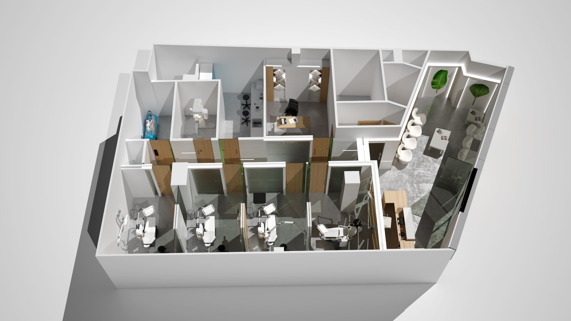 Proyecto integral de diseño y decoración para transformar el espacio en un entorno profesional y acogedor. La fachada se renovó completamente, utilizando materiales contemporáneos y un diseño atractivo que destaca la identidad de la clínica. Al entrar, los pacientes son recibidos en una recepción cuidadosamente diseñada, con un mostrador moderno y funcional que facilita la gestión del flujo de visitantes.